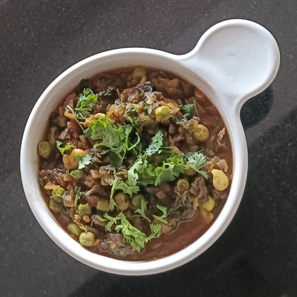 This traditional North Indian vegetable dish is popular during the cold winter months when both methi and peas are in season and cashews are used to counter the cold.